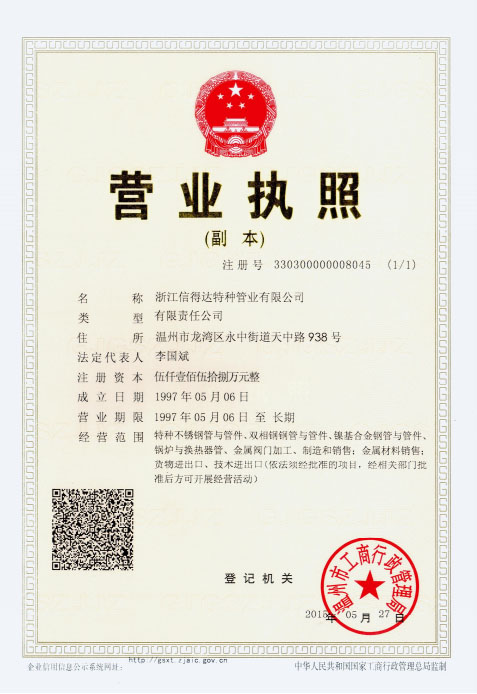 浙江信得達(dá)特種管業(yè)有限公司成立于1997年,占地面積28000平方米,注冊(cè)資金5158萬元,是國家高新技術(shù)企業(yè)、浙江省專精特新企業(yè),有4家控股公司,產(chǎn)品覆蓋了特種無縫換熱器管、高品質(zhì)不銹鋼管、鍛壓閥門制造商。